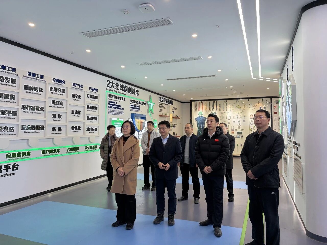 唯铂莱总经理陶福平陪同吴忠琼一行先后参观了唯铂莱生物的研发中心、工艺验证基地以及合成生物展厅,吴忠琼与唯铂莱负责人、科研人员进行了深入交流,全面了解了唯铂莱生物产业布局、产线投入和团队建设等情况。