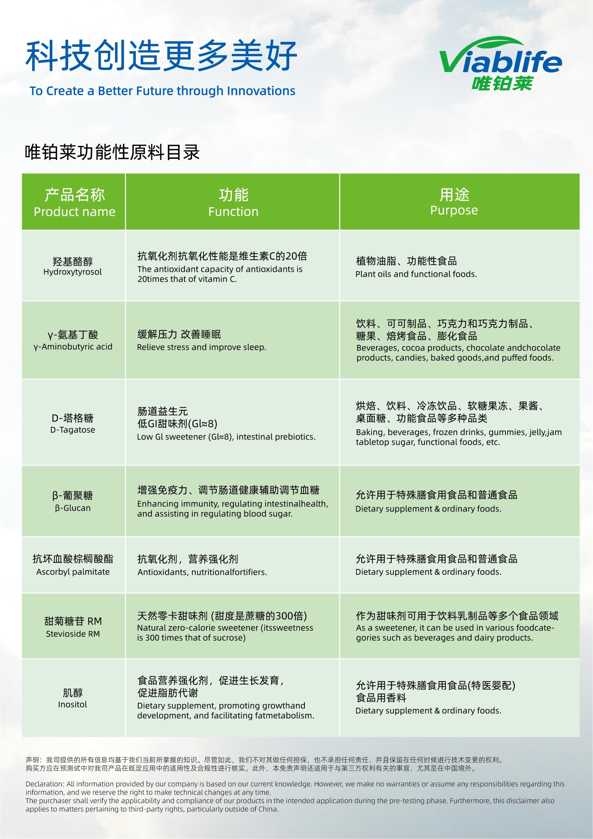 作为全球领先的合成生物与生物智造的高科技企业之一,唯铂莱生物将携榄青素系列、塔格糖、γ-氨基丁酸、β-葡聚糖、酪醇、抗坏血酸棕榈酸酯、甜菊糖苷RM、肌醇等一系列功能性健康原料亮相。